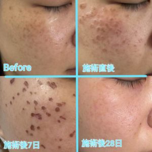 * 施術後、一時的にシミが濃く浮き出たように見えることがありますが、これはメラニンが肌表面に上がってきているサインです